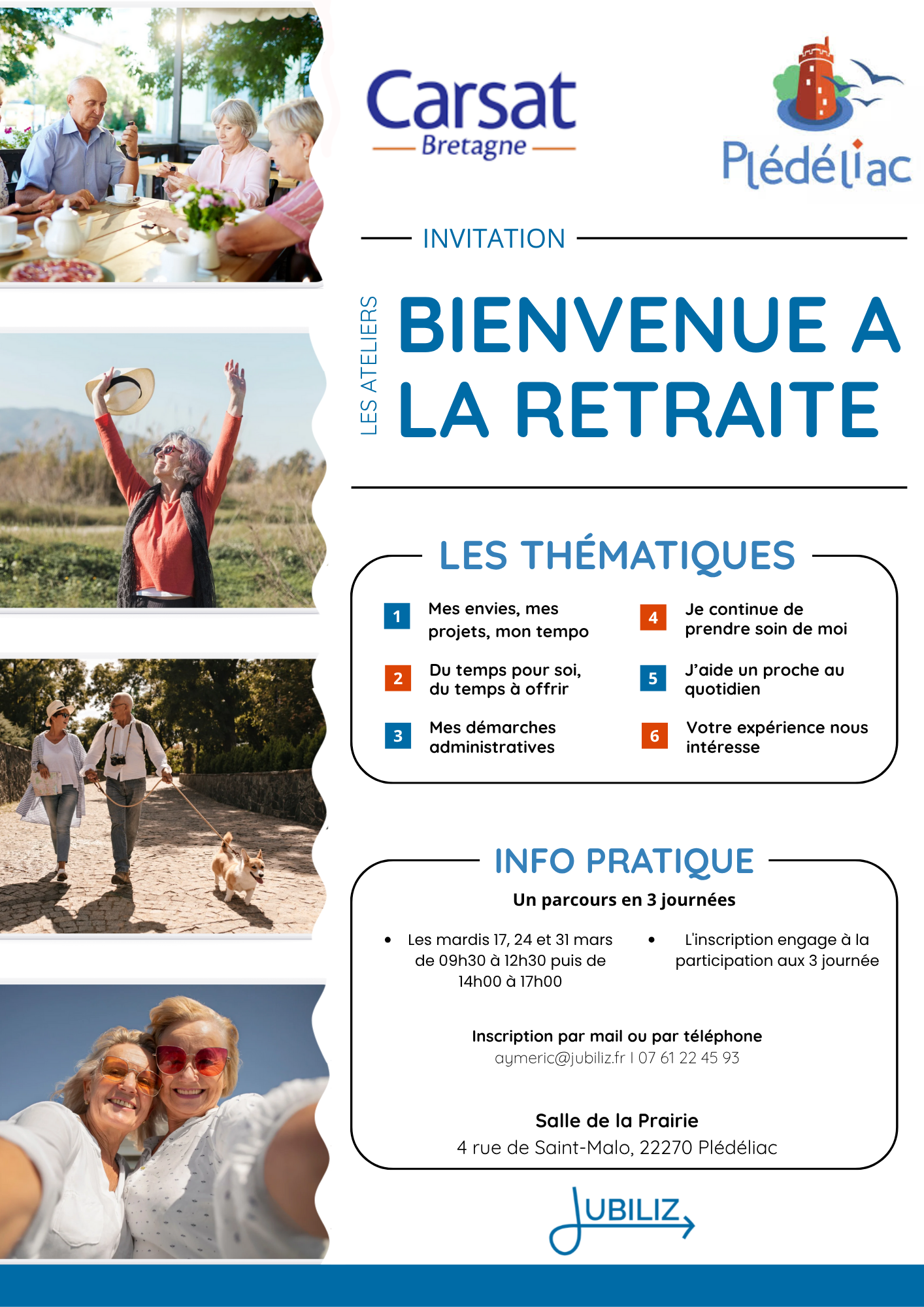 La Carsat Bretagne et la commune de Plédéliac, en partenariat avec Jubiliz, vous invitent à participer à l’atelier “Bienvenue à la retraite”, un moment convivial pour bien vivre cette nouvelle étape de la vie.