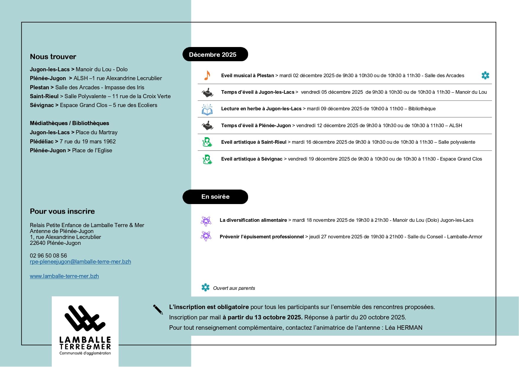 Découvrez le programme des animations du Relais Petite Enfance - Antenne de Plénée-Jugon pour la période de novembre / décembre 2025.